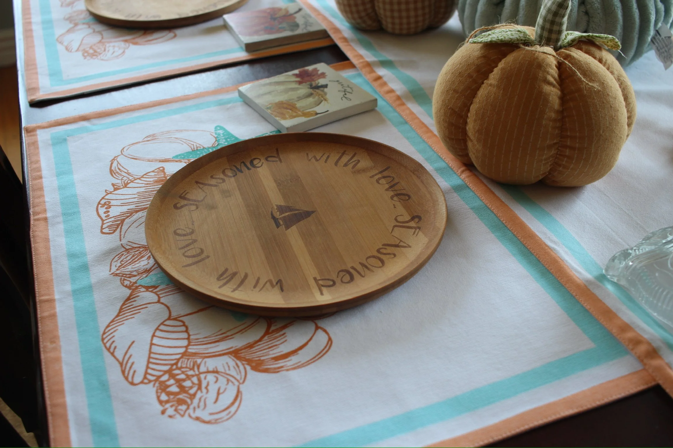 Delicious Homemade Pumpkin Pie → Serve on the “seasoned with love” wooden plate, for a charming, coastal centerpiece. Add a tea towel nearby for texture and warmth.